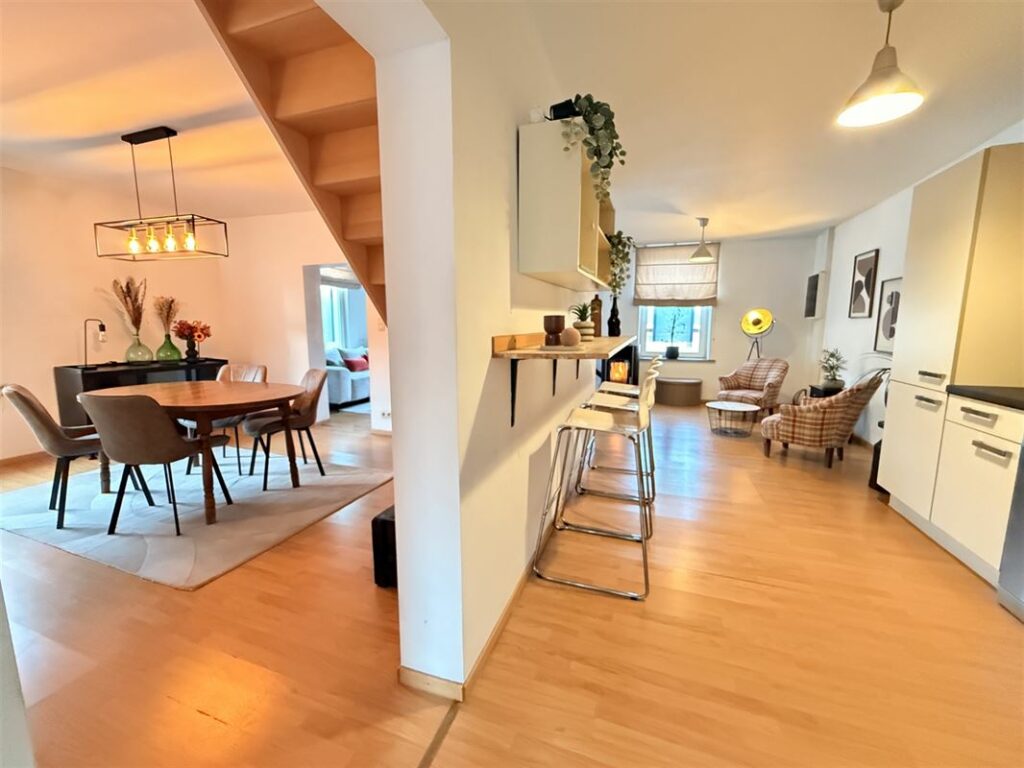 À l’étage, un superbe duplex comprend un hall d’entrée de 15m2, Wc, un séjour 22m2, une salle à manger 15,78m2, une cuisine équipée, ainsi que quatre chambres (voire une cinquième chambre possible), et deux salles de bain. Terrasse de 14m2 + 2 places de parking. Double vitrage, Chauffage au Pellet, nouvelle toiture.